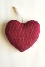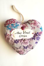 This sweet heart sachet is filled with a lightly-scented organic rose petal potpourri. The front applique is inscribed with the phrase, "Amor Vincit Omnia ( Latin for "Love Conquers All"). Made of 100% vintage cotton and embellished with plastic beading. Cream-colored gimp hanging loop.